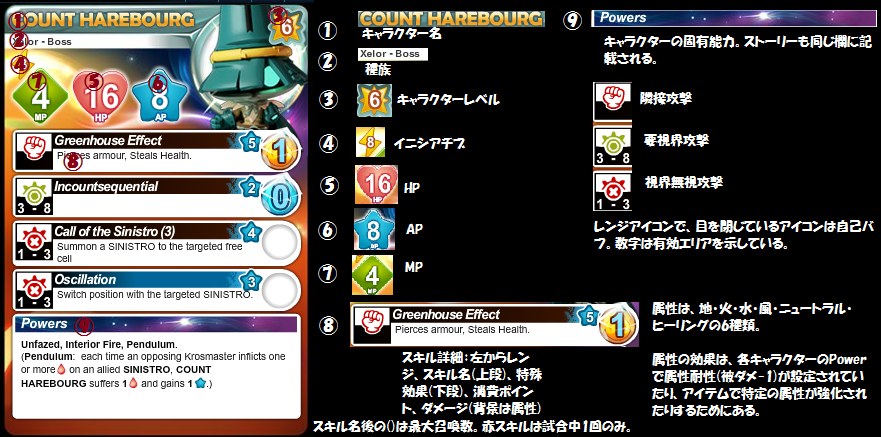 | Widsom | この能力をもつキャラクターが相手のクロスマスターを倒した場合、追加で1GGを得る。また、この能力を持つキャラクターが倒された場合、相手は追加で1GGを得る。 |